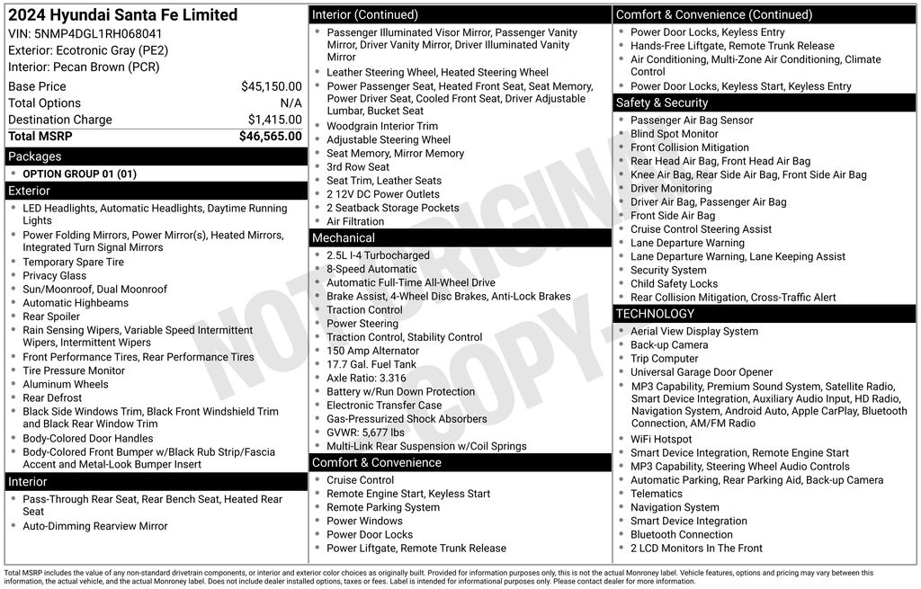 Certified. Ecotronic Gray 2024 Hyundai Santa Fe Limited AWD Shiftronic 2.5L I4 20/28 City/Highway MPG Hyundai Certified Used Vehicles Details: