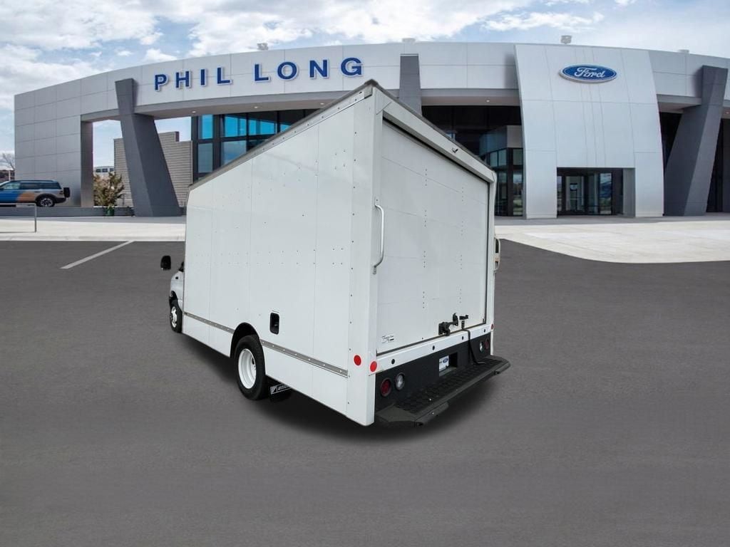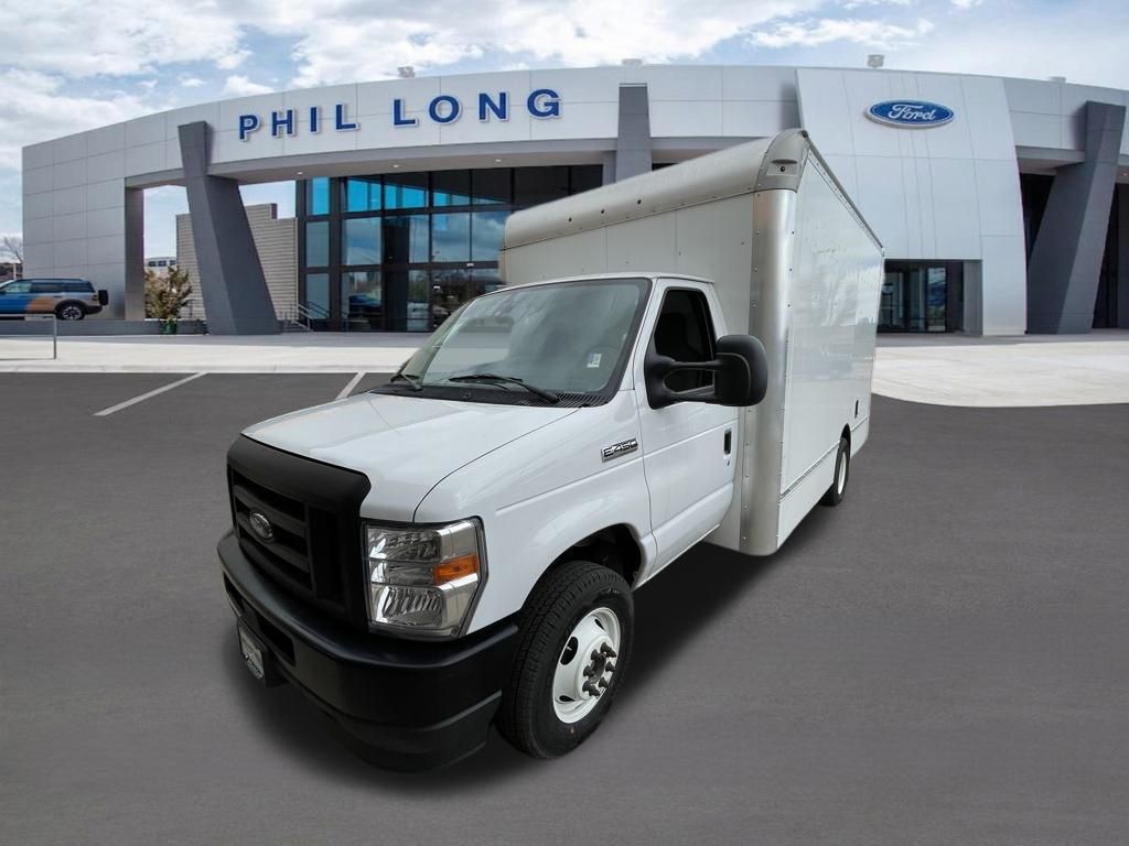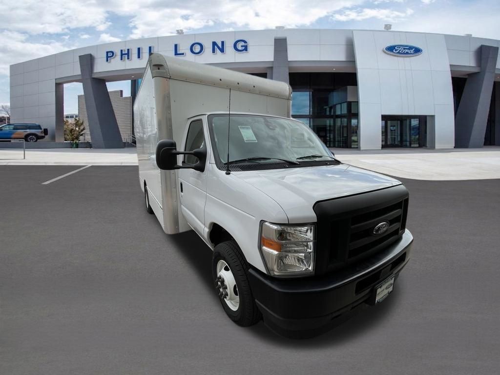 Oxford White 2024 Ford E-450SD DRW 14' Box Truck RWD 6-Speed Automatic with Overdrive 7.3L V8 7.3L V8, 6-Speed Automatic with Overdrive, RWD, Oxford White, Medium Flint w/Cloth Bucket Seats.
