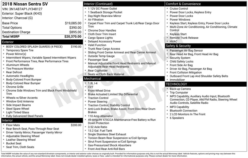 Super Black 2018 Nissan Sentra SV FWD CVT with Xtronic 1.8L 4-Cylinder DOHC 16V 29/37 City/Highway MPG