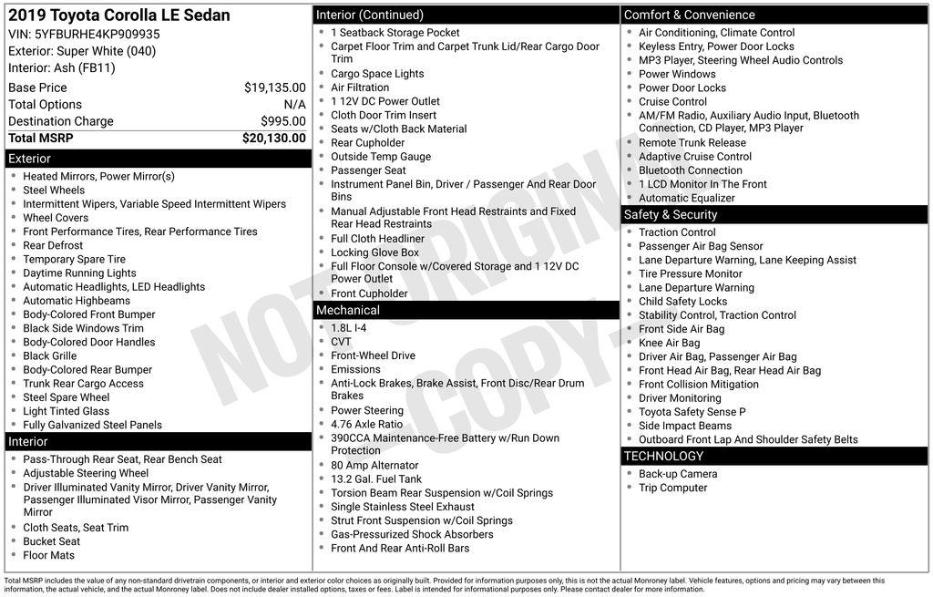 White 2019 Toyota Corolla L FWD CVT 1.8L I4 DOHC 28/36 City/Highway MPG